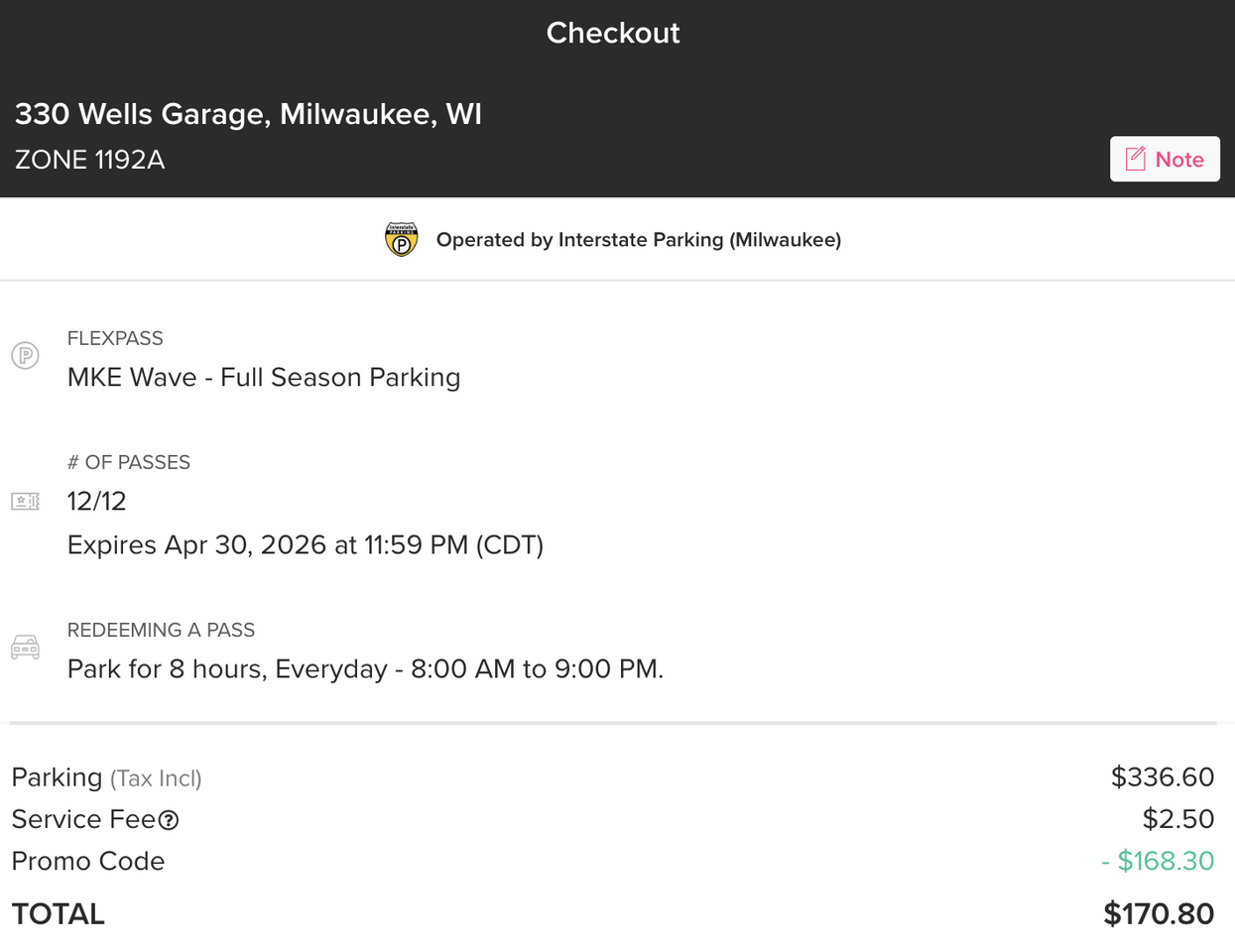 Click the following link Milwaukee Wave Season Parking Passes and choose either the “MKE Wave - Full Season Parking”; “MKE Wave - 6 Game Parking” or “MKE Wave - 3 Game Parking” and provide the requested information. To get your discount please enter MKEWVE where it says “Add Promo Code.” See screenshot below for an example of what the cart with the promo applied looks like for Full Season: